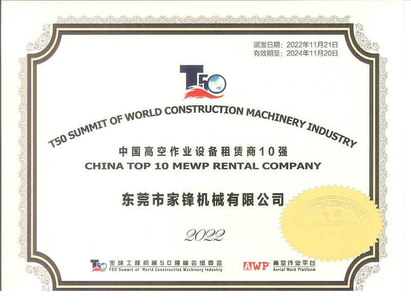 東莞市家鋒機械有限公司成立于2016年,是專業的高空作業平臺租賃、銷售服務商,擁有徐工、中聯、吉尼、捷爾杰等國內外知名品牌的高空作業設備八千多臺,連續四屆榮膺“中國高空作業設備租賃商十強企業”及“中國高空作業平臺租賃業十大品牌”,并于2021年首次榮膺“中國工程機械租賃商十強”,是立足華南、輻射全國、規模大、服務優,極具競爭力和影響力的企業。短短幾年,已相繼與世界機械巨頭徐工集團、中聯重科達成戰略合作。